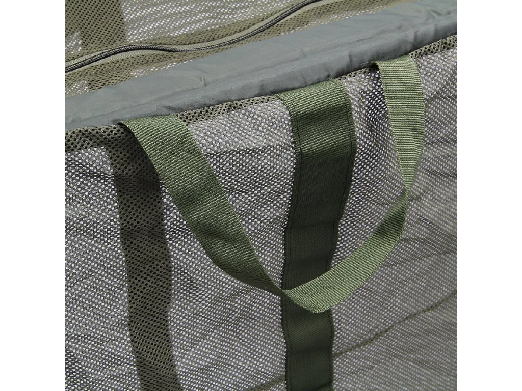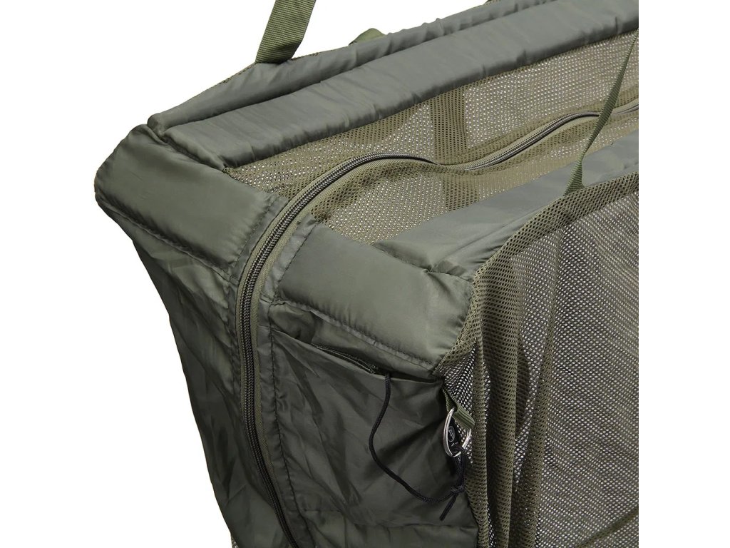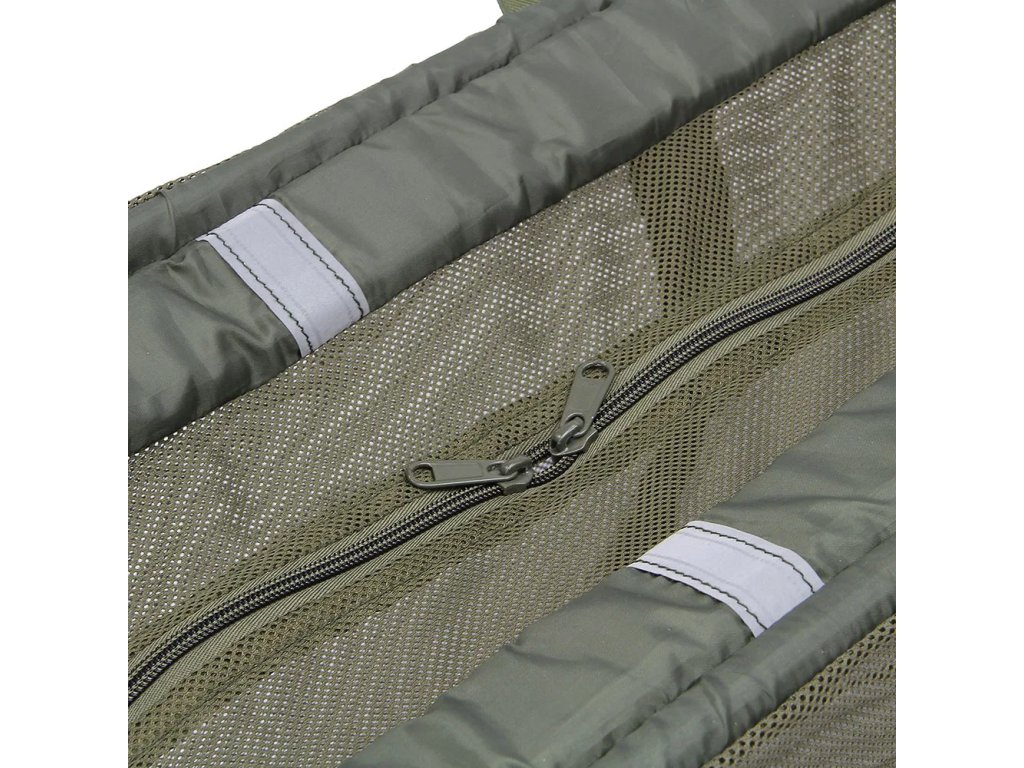 Jemná síťka šetrná k rybám umožňuje rychlý odtok vody a zároveň chrání rybu při manipulaci. Díky čtyřem úchytům lze sak snadno přenášet jednou nebo dvěma osobami, a reflexní pásky zajišťují viditelnost i za sníženého světla. Pro pohodlné vážení slouží dva pevné popruhy, a vše můžete snadno uložit do praktického přepravního pouzdra, které je součástí balení.