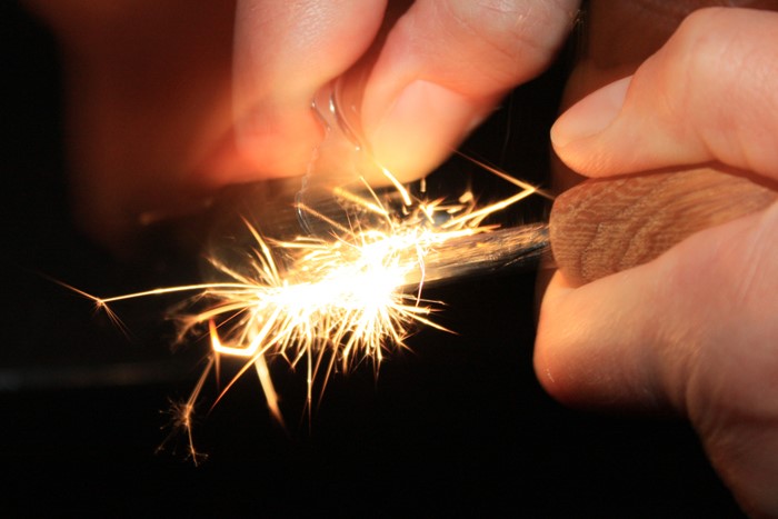 Firesteel uchopíme do prstů za plastové držátko a rychle po něm předejeme hřbetní stranou nože pod správným úhlem. Jak je vidět, pro rozdělání ohně není potřeba ani moc materiálu, stačí, aby byl suchý a aby ho jisrky pěkně pokropily.