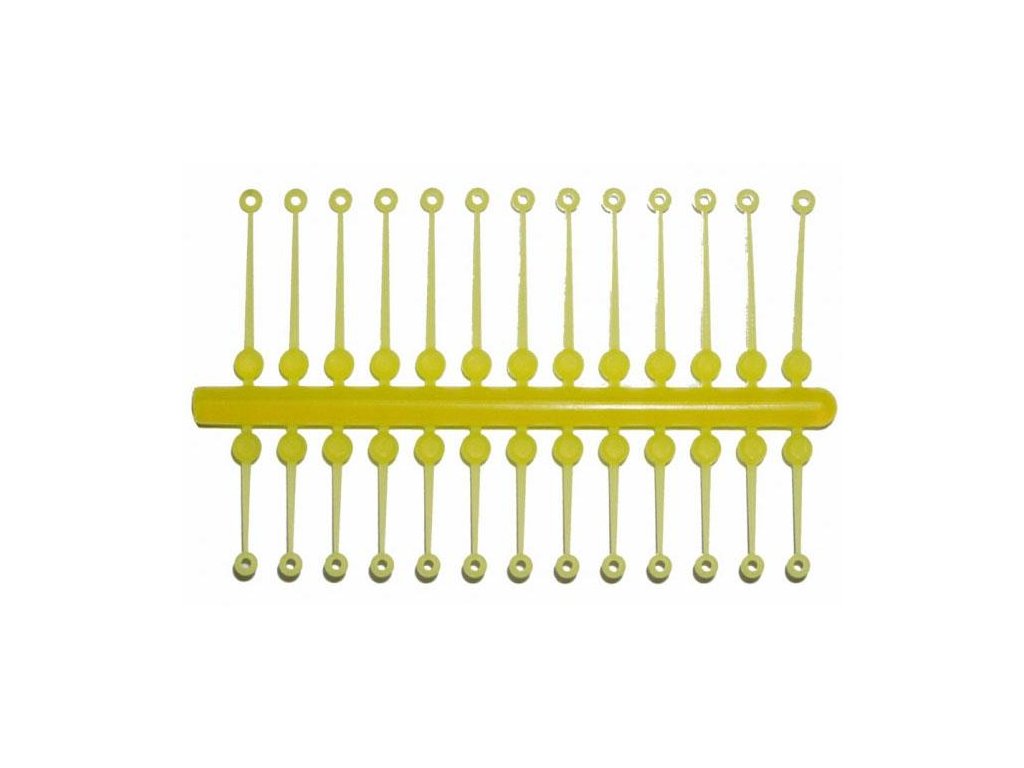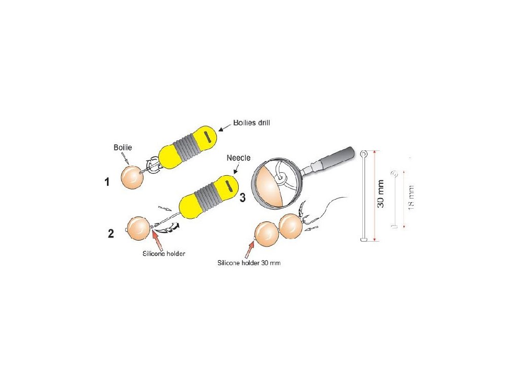 Velice rychlé nastražení. Provrtáme peletu, protáhneme gumičku (na jedné straně "T" zarážka, na druhé očko) a do očka na gumičce zapíchneme háček. Orientační foto - zarážky v balení jsou vždy stejné, tedy všechny mají délku buď 15 nebo 25mm !!