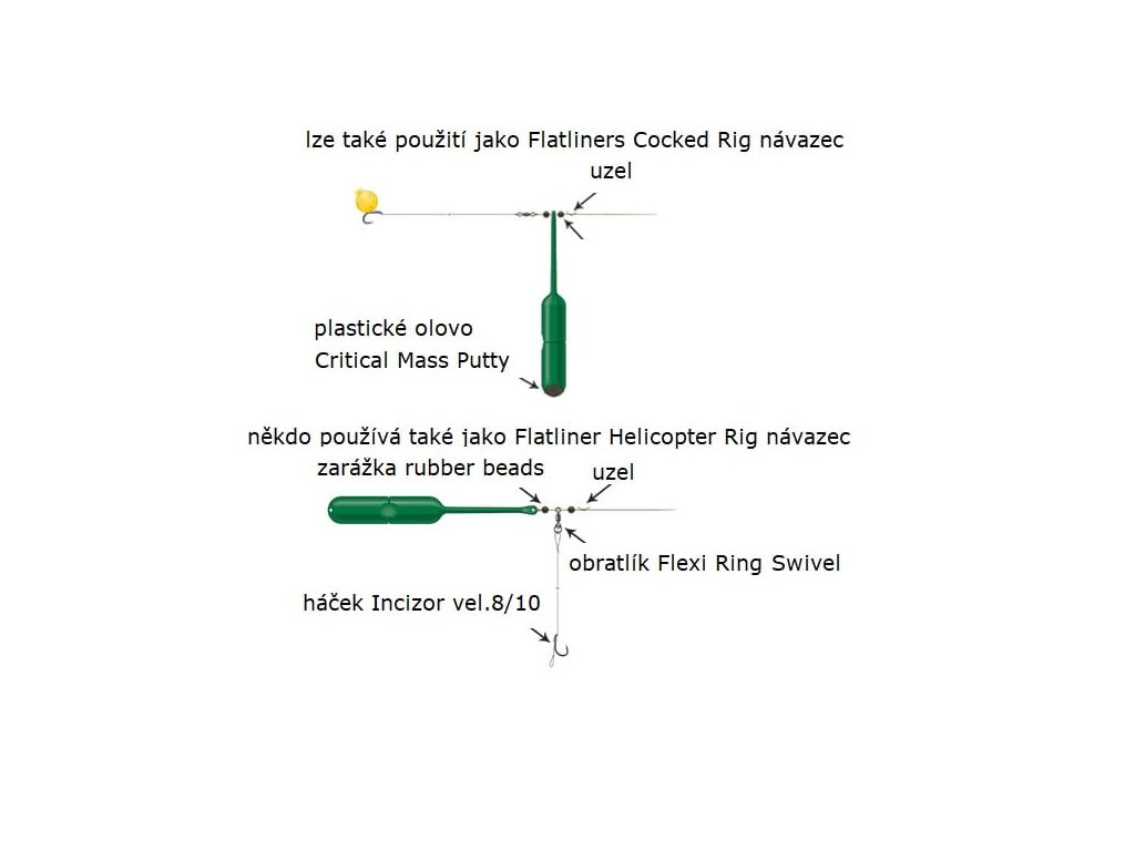 Tyto plovoucí indikátory s názvem Flatliners byly navrženy především proto, aby nerušily a nevířily zvuk pod vodní hladinou, proto zůstávají ležet na vodní hladině bez povšimnutí a neruší tak samotné krmení, přičemž stále nabízejí možnost obou prezentací. Dodává se ve smíšeném balení tří velikostí - malé (13 gramů), střední (20 gramů) a velké (30 gramů). Všechny tři indikátory jsou v matně zelené barvě, která splyne s prostředím. Na boku mají prohlubeň pro vázání nástrah s PVA nebo pro montáže na dlouhé vzdálenosti. Na horní straně je očko pro uvázání na vlasec. Specifikace: - v balení po třech kusech ve třech gramážích - gramáže: malé (13 g), střední (20 g), velké (30 g) - v tmavě zelené barvěDoplňkové parametry
