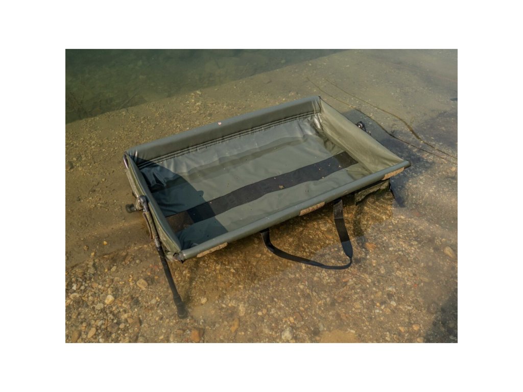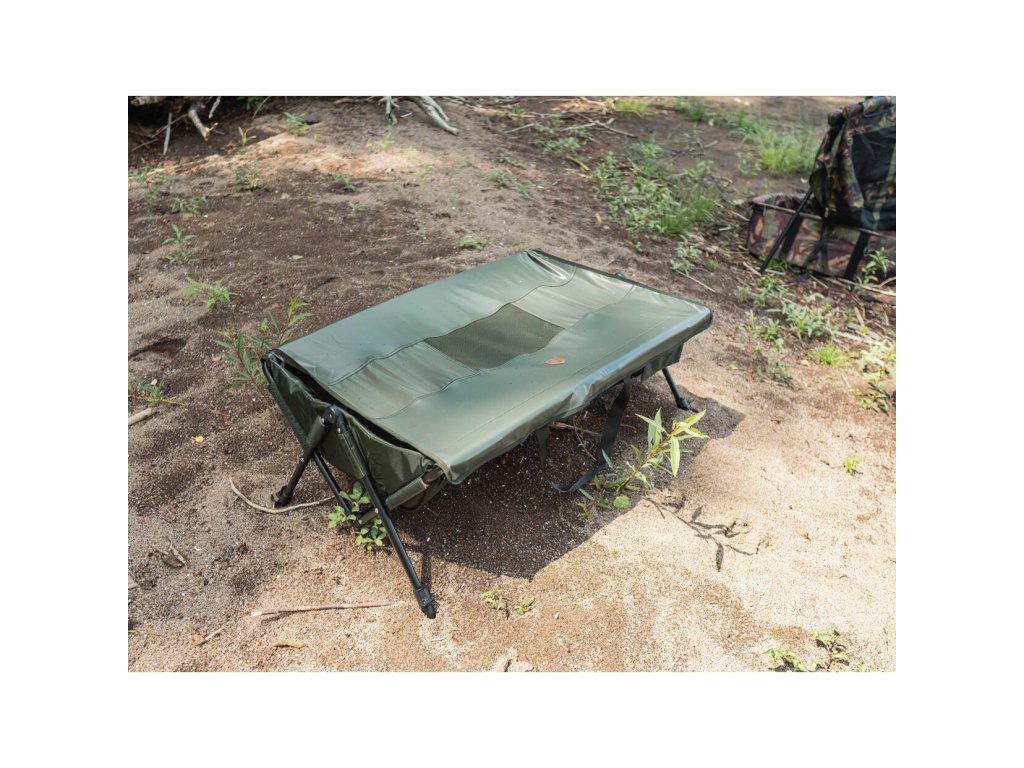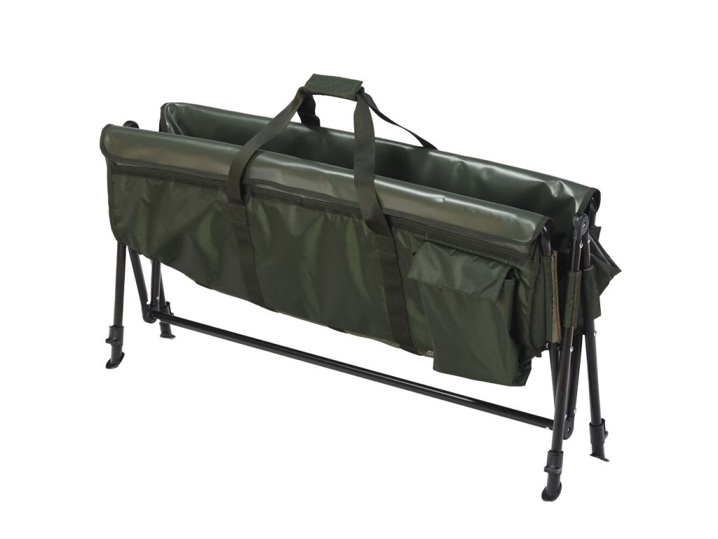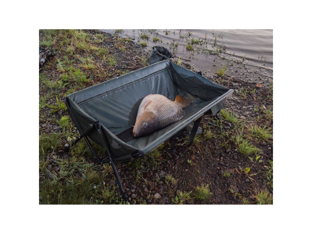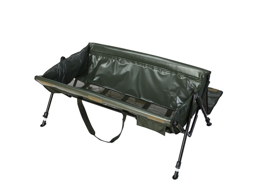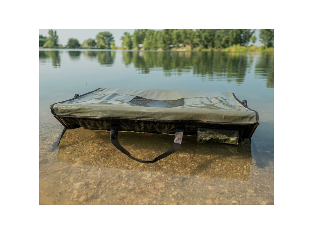 Konstrukce je vyrobena z hliníkové slitiny s velkou nosností a osazena nastavitelnými nožkami.Polstrovaná část je vyrobena z měkkého PVC, které je voděodolné a je dobře omyvatelné.Ve spodní části podložky je jemná a silná pogumovaná síťovina, která rychle odvádí vodu.Pro snadný transport a manipulaci je osazena dvojitým popruhem. Další výhodou této podložky je blesku rychlé rozložení a vrchní přehoz, který zabrání nežádoucímu vypadnutí úlovku.V boční kapse naleznete menší podložku pod nohy, která se skvěle hodí při klečení a pózování s úlovkem při focení. Rozměry: 104x64x40 cmHmotnost: 3,6 kgDoplňkové parametry