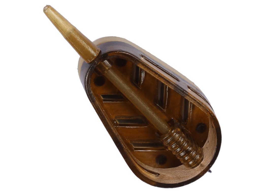 Feederová krmítka vhodná do proudné vody, které se hodí jak pro plnění krmítkovou směsí, tak vlhčenými peletami. Propracovaný design krmítka obsahuje otvory ve spodní, tak i bočních stěnách, což zaručuje postupné uvolňování návnady. Díky spodní olověné zátěži, Vám krmítko poletí daleko a vždy dopadne olověnou stranou na dno, a tím máte 100% jistotu že nástraha je na svém místě. Krmítko je primárně určeno k použití v průběžné sestavě, ale za pomocí obratlíku či gumového korálku se může zafixovat a tím nám vznikne buď pevná nebo poloprůbežná montáž. Vnitřní trubička je přesně navržená pro zafixování pevnostního obratlíku vel. 8, který je součástí každého balení. V nabídce jsou tyto varianty sad: 20+30g, 30+40g a 40+50g (+vždy formička) Barva krmítka: hnědá Barva formičky: modráDoplňkové parametry