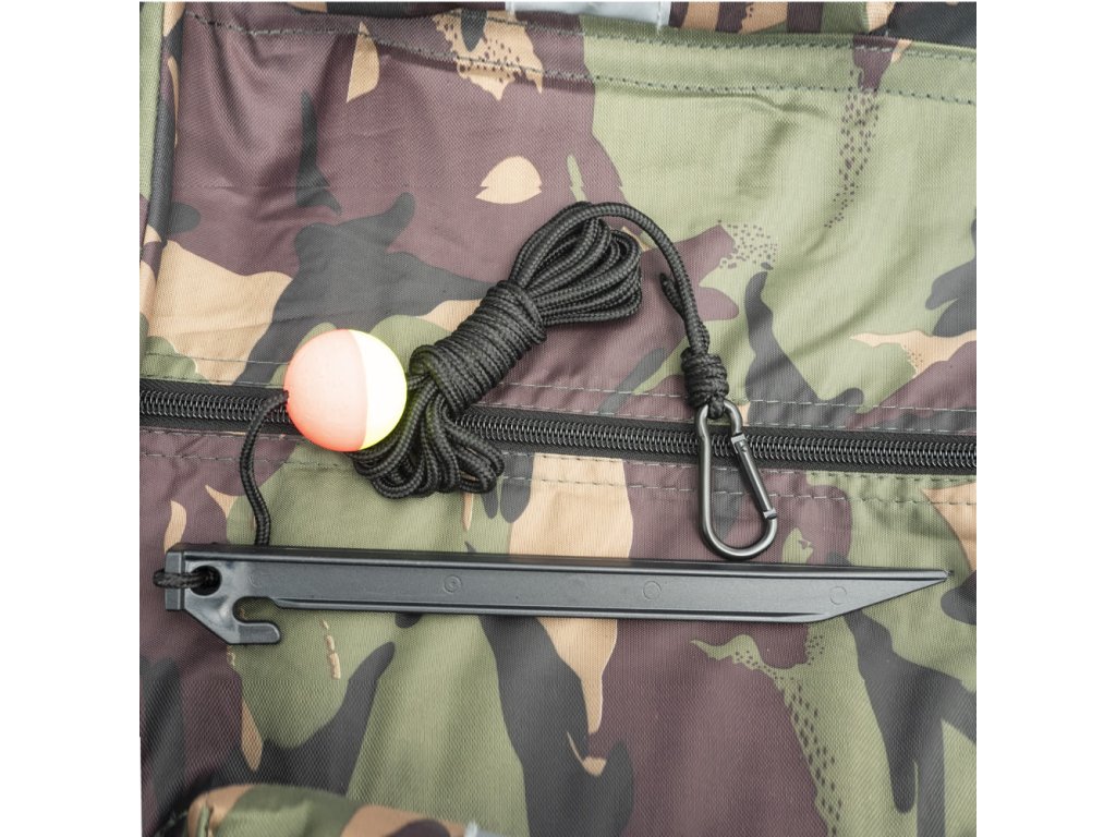 Vážící sak má čtyři plováky, které mají reflexní pásky pro snadnou viditelnost v noci. Ve vrchní centrální části je dvojitý popruh, který je zakončen ocelovými kroužky a je určen k připojení váhy. Dvojité zipy jsou po celé délce. Velký důraz, byl kladen na síťové otvory, aby k úlovku proudil dostatek prokysličené vody. Z obou boků saku jsou plastové „D“ kroužky, na které je možno připojit 3m lano, které je zakončeno plovákem s plastovým kolíkem, který je určen k zajištění saku u břehu. To vše je ukryto v kapsičce na suchý zip. Je dodáván včetně nepromokavého obalu, který je zevnitř pogumovaný, takže zabrání úniku vody a pachu ze saku. Rozměry: Délka: 120 cm Šířka: 29 cm Výška 65 cm Hmotnost: 1,1 kg Barva: maskáčový vzorDoplňkové parametry
