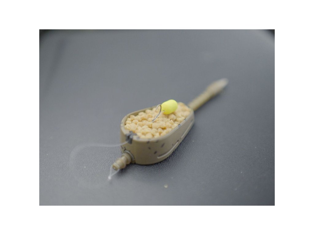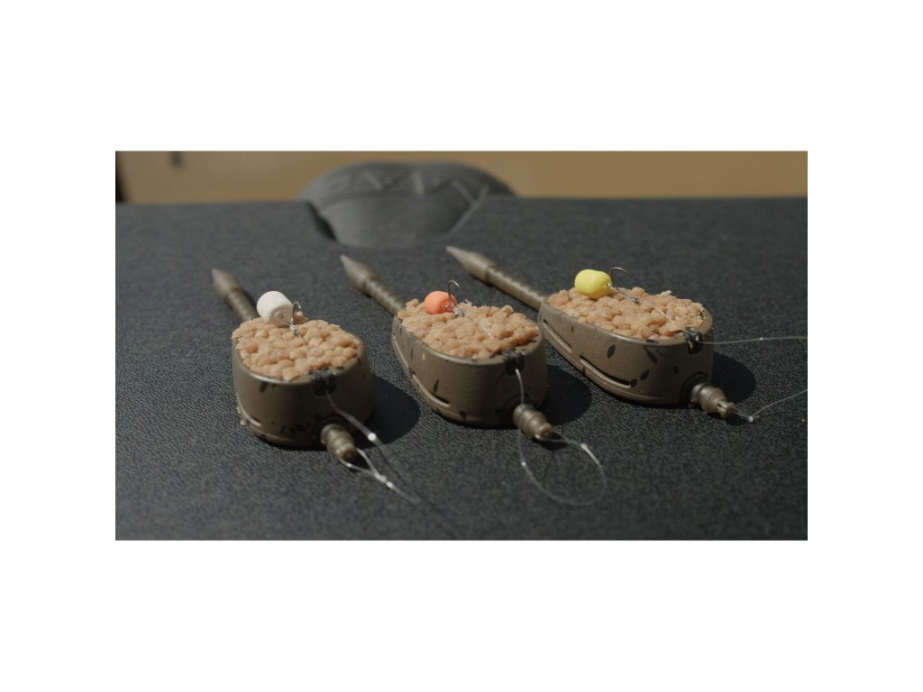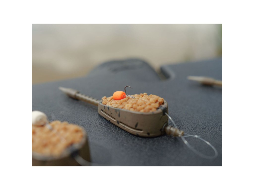 Integrovaná spona vám umožňuje nastavit délku vlasce s háčkem a směr hrotu háčku a snadno se uvolní ze sevření, když je ryba chycena. Každé krmítko je plněno zepředu, aby byla zajištěna maximální vzdálenost a přesnost náhozu, a je vybaveno chytře navrženou šikmou základnou, která vytváří menší výtlak vody, když krmítko dosedne na hladinu vody. Tato nakloněná základna nejen chrání návnadu v krmítku před uvolněním a vypadnutím při dopadu při nahazování, ale také vytváří méně hluku při dopadu, což vytváří nerušivý zvuk při vstupu do vody. Dalším chytrým designem jsou spodní otvory na krmítku, protože nejsou pouze zúžené, aby zajistily pomalejší uvolňování návnady, ale jsou natočeny v opačném směru, než je směr, ve kterém krmítko dopadá, čímž opět chrání návnadu uvnitř při vstupu do vody. Každé krmítko má také vyměnitelný design, takže krmítka lze rychle měnit, aniž by bylo nutné návazec rozebírat. Specifikace: - bezolovnaté - hmotnost: 30 gDoplňkové parametry