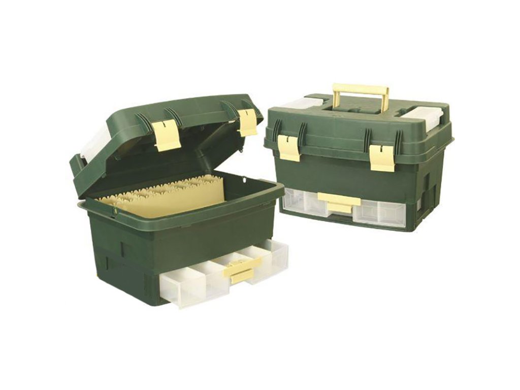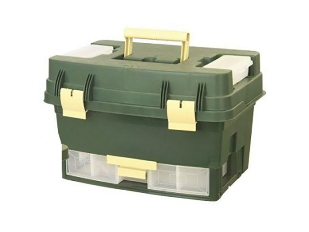Praktický kufr nejen na rybářské potřeby - 2 menší samostatně vyjímatelné krabičky na drobnosti, zásuvka se stavitelnými přihrádkami. V horní části je velký prostor na objemné části výbavy a vysoký prostor na velké nástrahy - třeba i pilkery na mořský rybolov - celkové rozměry cca. 45x30x30cm.