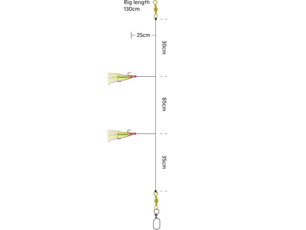 K lovu tresek, makrel, mníků atd. Háčky 6/0. Síla použitého vlasce 1,2mm/síla návazců 1mm. Délka chobotnic cca. 15cm. Háčky i obratlíky mají povrchovou úpravu odolnou mořské vodě.