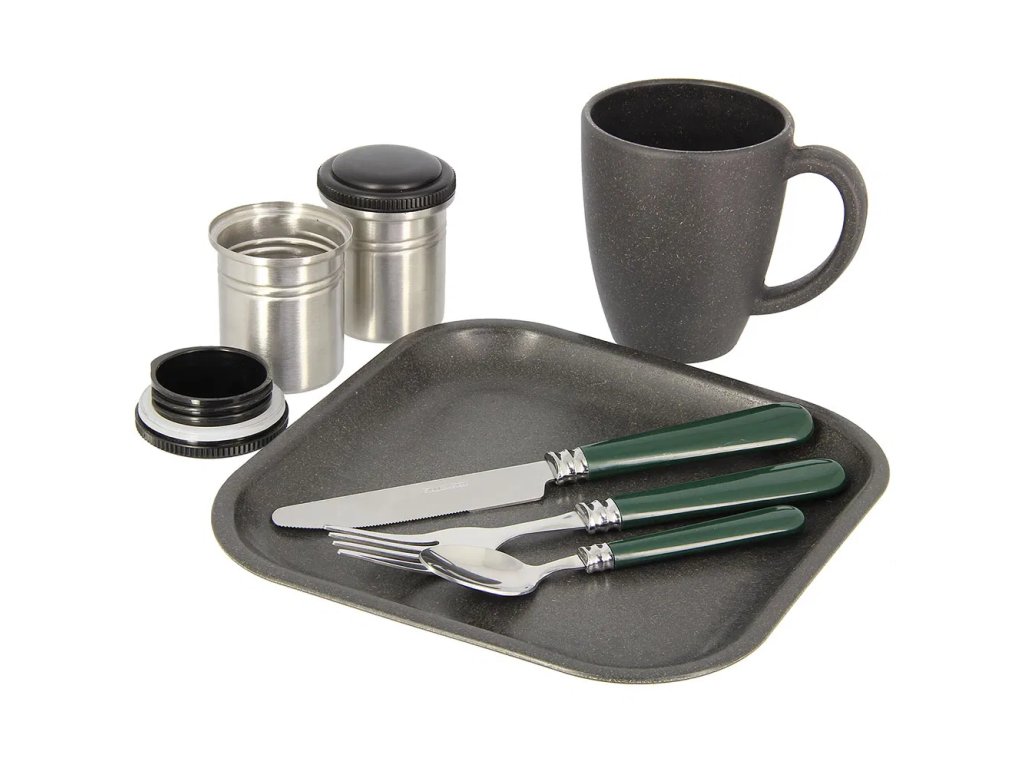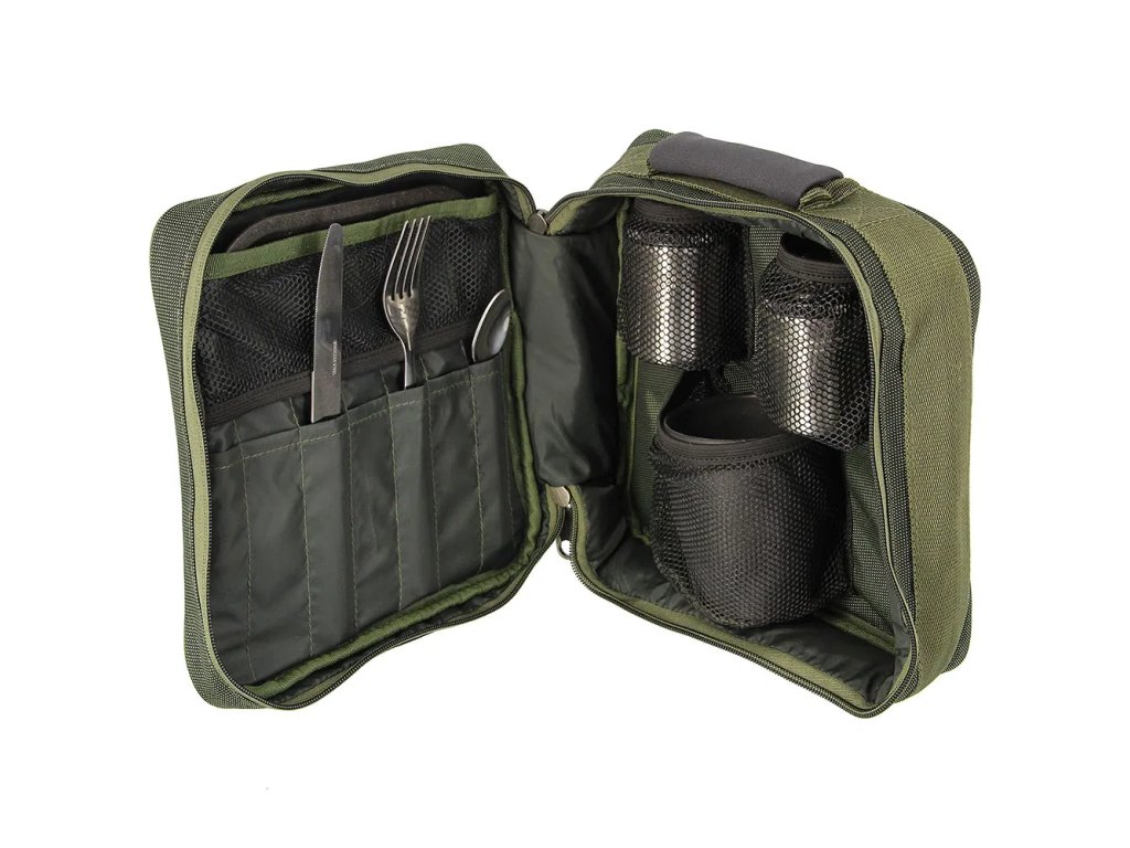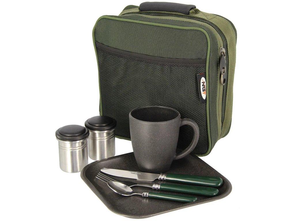 Set obsahuje vše, co potřebujete pro pohodlné stolování během rybářské nebo kempingové výpravy.