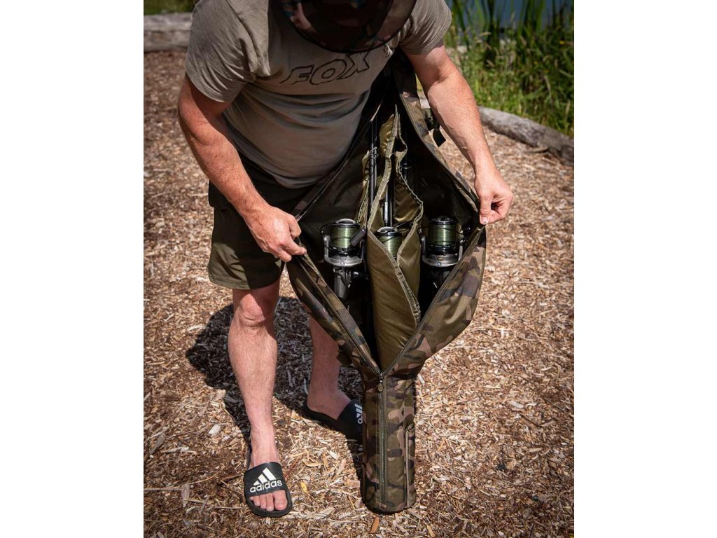 Jednokomorový obal od značky FOX na 3 kaprové pruty - oddělující přepážka v celé délce zabrání vzájemnému poškození a suché zipy poskytují dokonalou fixaci každého prutu. Robustní 10mm dvojcestný zip (2 jezdci) umožňuje velmi pohodlnou manipulaci s kaprovými pruty - obal je dostatečně široký pro 3 libovolné rybářské pruty.