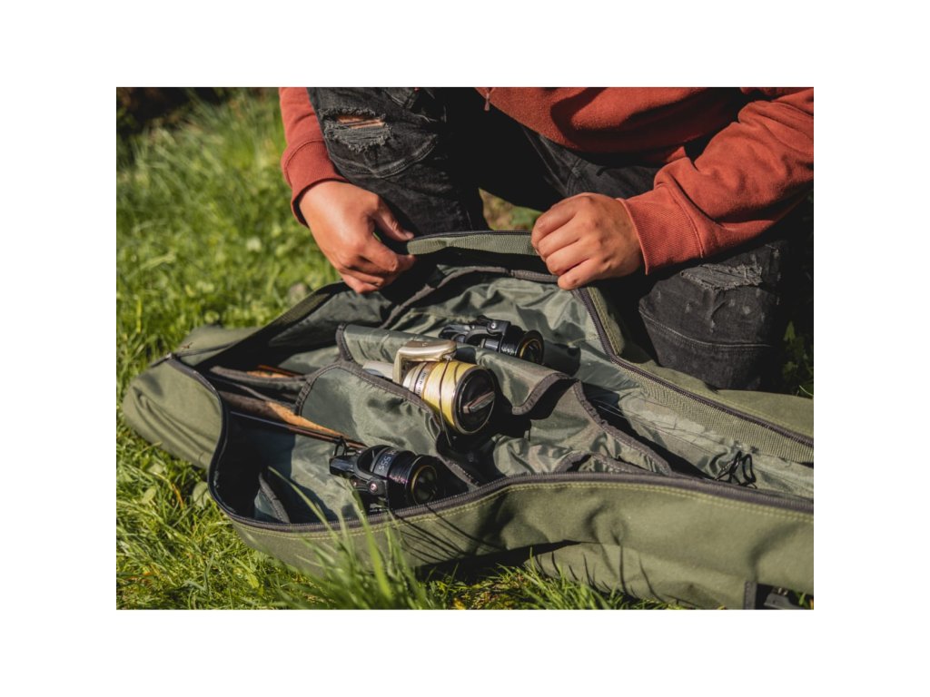 Díky jeho uspořádání je možné uskladnit do hlavní komory až 3 pruty společně s navijáky. Po stranách nalezneme boční kapsy pro další pruty nebo jiné doplňky jako jsou podběráky apod. Specifikace: - silné klipsny a popruhy - plně polstrované pro maximální ochranu - externí zipy a popruhy - použitý materiál nylon 600D - polstrovaný ramenní popruh - kapsy pro olova - barva: zelenáDoplňkové parametry