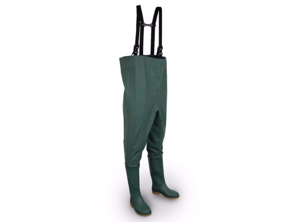 PVC brodící kalhoty jsou vyrobeny z odolného a flexibilního PVC materiálu, který je zcela vodotěsný a pohodlný na nošení. Prsačky jsou vybaveny nastavitelnými popruhy a rychloupínacími plastovými přezkami a mají podrážku s hrubým vzorkem pro lepší přilnavost v kluzkých podmínkách, díky čemuž jsou ideální i pro hluboké brodění. Pro větší odolnost jsou extra široké švy svařeny pro úplnou bezpečnost a v případě nehody je součástí balení snadno použitelná sada na opravu.