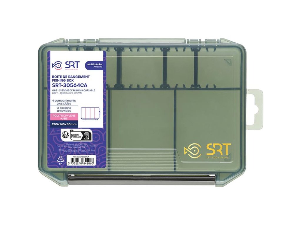 Disponují čtyřmi přihrádkami se třemi odnímatelnými přepážkami, což umožňuje snadné přizpůsobení vašim potřebám. Díky svému štíhlému profilu jsou tyto boxy kompaktní a nabízejí dostatečnou úložnou kapacitu, ideální pro organizaci drobného příslušenství a zároveň šetří místo. Ultrapraktický systém uzavírání klipem zajišťuje bezpečné uzavření a chrání vaše vybavení během přepravy. Tyto boxy jsou k dispozici v kouřově šedé barvě a o rozměrech 205 x 145 x 30 mm, takže jsou ideální pro rybáře, kteří hledají kompaktní, praktické a odolné řešení pro uložení svého rybářského vybavení. Specifikace: - box z polypropylenu a ABS plastu - 4 přihrádky - 3 odnímatelné přepážky - štíhlý a diskrétní box nabízí dostatečnou úložnou kapacitu - ultrapraktický systém uzavírání klipem - kouřově šedá barva - rozměry: 205 x 145 x 30 mmDoplňkové parametry