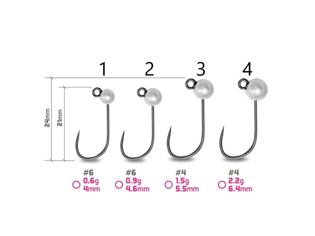Dostupné ve čtyřech velikostech - např. model č.1 - hmotnost hlavičky 0,6g, velikost háčku 6, průměr hlavičky 4mm !