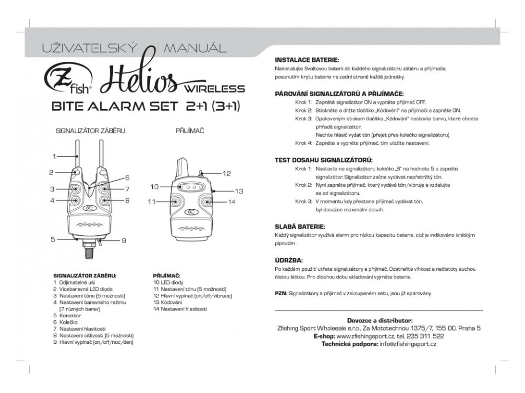 Nadčasový design, vysoká kvalita, maximální výbava, dlouhá životnost a špičkové zpracování. To je základní charakteristika modelu Helios, nejvyšší řady hlásičů od české značky Zfish. U hlásičů lze klasicky regulovat hlasitost, tón a citlivost. Navíc je možné vybírat až ze 7 různých barevných diod. Při nočním chytání se můžete spolehnout na modrou poziční diodu. Tyto hlásiče záběru jsou vybaveny odjímatelnými záchytnými chrániči pro ochranu vašich prutů proti vypadnutí. Voděodolnost je samozřejmostí.