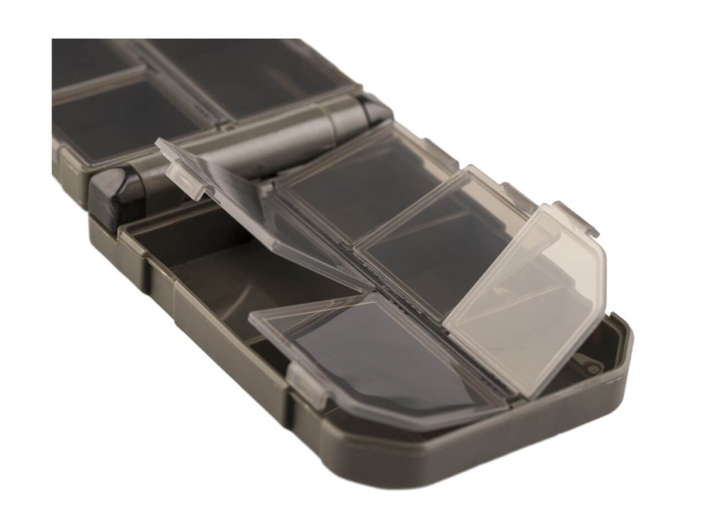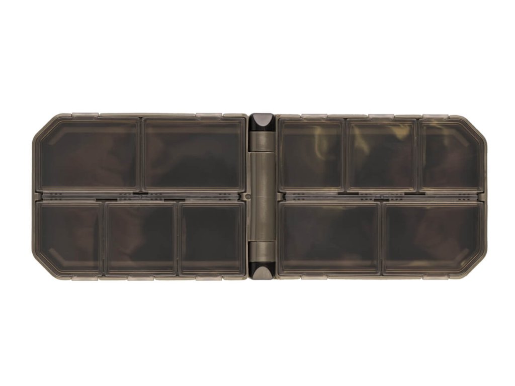 ZFISH Mini Double Box M je praktická oboustranná krabička/organizér od české značky ZFISH. Tento kompaktní box disponuje 10-ti samostatně uzavíratelnými přihrádkami s čirými krytem, takže snadno a ihned vidíte kam a pro co sáhnout. Bezpečné uzavírání, nebo nechtěné otevření zajišťují velice pevné panty. Jednoduchý a čistý design se zkosenými a oblými hranami nejen skvěle vypadá, ale díky oblým tvarům je i samotná manipulace mnohem příjemnější. Výborný dojem už jen podtrhují odolné materiály a komponenty ve velmi elegantním, temně olivově zeleném provedení. Tento kompaktní box je například vhodný na nejdrobnější bižuterii a příslušenství, které potřebujete mít vždy po ruce, ideálně někde v kapse.
