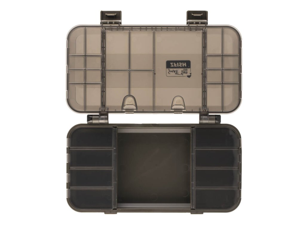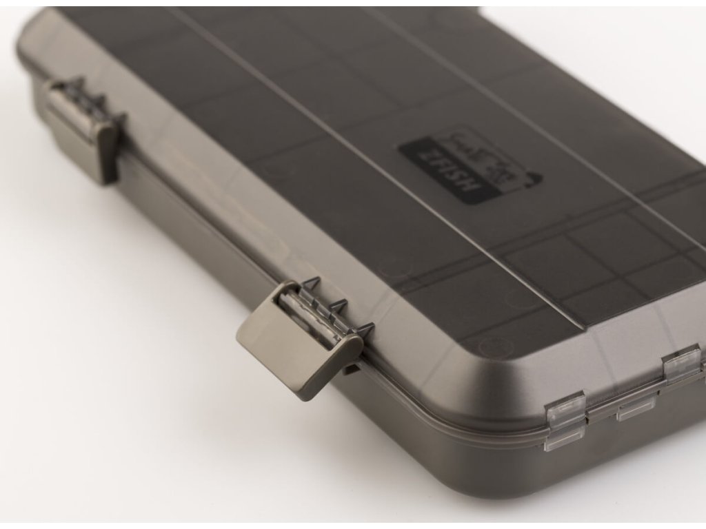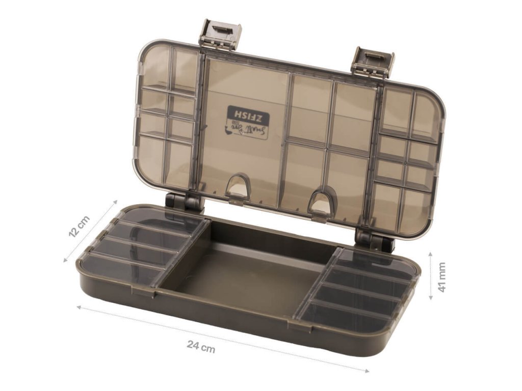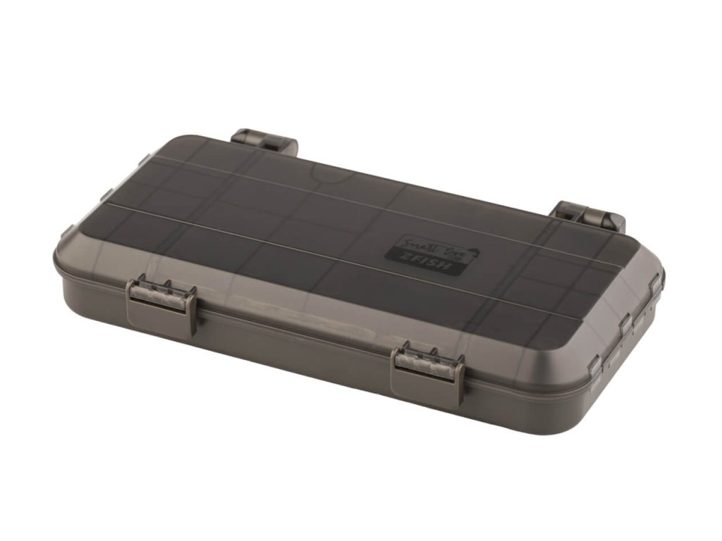 ZFISH Smart Box ZFS je praktický a univerzální tackle box od české značky ZFISH. Tento organizér je upravenou, mělkou verzí Smart boxu ZFX. Rozdíl spočívá pouze ve spodní části, která není tak hluboká (pouze 4,5 cm) a disponuje 9-ti pevnými přihrádkami, z nichž prostřední je otevřená a 8 bočních je stejně provedených a uzavíratelných jako ve víku. Bezpečné uzavírání, nebo nechtěné otevření zajišťují dva zavírací klipy a velice pevné panty, které dokonce dokážou udržet box otevřený a usnadní Vám práci. Samotné víko boxu také funguje jako organizér a disponuje 21-ti menšími samostatně uzavíratelnými přihrádkami s čirými krytem, takže snadno a ihned vidíte kam a pro co sáhnout. Jednoduchý a čistý design se zkosenými a oblými hranami nejen skvěle vypadá, ale díky oblým tvarům je i samotná manipulace mnohem příjemnější. Výborný dojem už jen podtrhují odolné materiály a komponenty ve velmi elegantním, temně olivově zeleném provedení. Díky svým rozměrům se jedná o kompaktní box vhodný na kratší kaprařské nebo feeder vycházky do menších batohů.