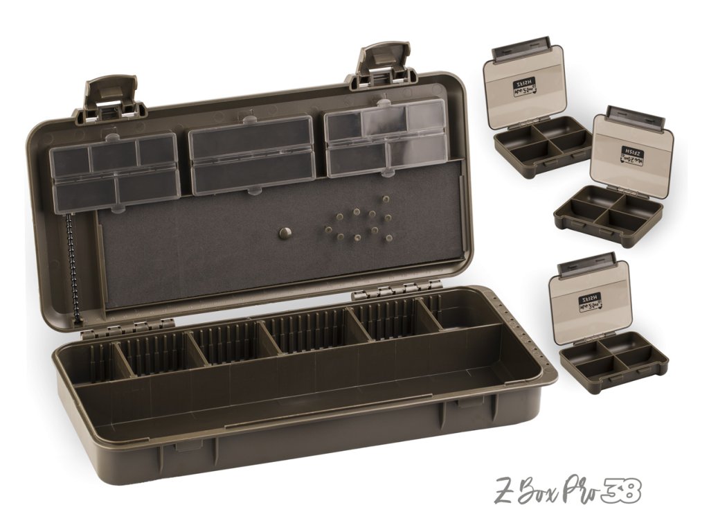 ZFISH Z-Box PRO 38 je praktický a univerzální tackle box od české značky ZFISH. Tento šikovný organizér je kompaktnější verzí modelu PRO 45 a disponuje 38-mi přihrádkami z nichž většina je nastavitelná díky vyjímatelným přepážkám. Bezpečné uzavření a nechtěné otevření zajišťují dva bytelné aretační klipy. Víko organizéru je opatřeno robustními, uzavíratelnými přihrádkami a dále nabízí kompletní zásobník na návazce s hrazdou pro háčky, pěnovou částí o velikosti 270 x80 mm a 10-ti kusy špendlíků a integrovaným pravítkem. Další vychytávkou u tohoto konkrétního modelu tackle boxu je integrovaná děrovaná lišta pro zavěšení hotových montáží umístěná na jedné z kratších stran spodní části boxu. Celkové rozměry boxu jsou 350 x165 cm s hloubkou 50 mm, takže spolehlivě pojme drobnou bižuterii včetně pomůcek pro samotné vázání návazců a montáží, jako jsou nůžky, kleště, jehly, utahovače uzlů apod. Nadstandardní výbavou tohoto pořadače jsou další 3 menší samostatné krabičky o velikosti 102 x 80 x 24 mm s 4, 6 a 8-mi přihrádkami. Jednoduchý a čistý design se zkosenými a oblými hranami nejen skvěle vypadá, ale díky oblým tvarům je i samotná manipulace mnohem příjemnější. Celkově výborný dojem už jen podtrhují odolné materiály, jednotlivé komponenty ve velmi elegantním, temně olivově zeleném provedení. Tento organizér využijete při většině rybolovných technik, především však při kaprařině a feederu.